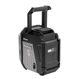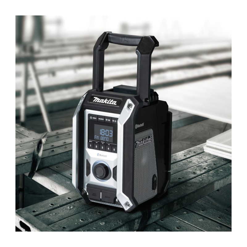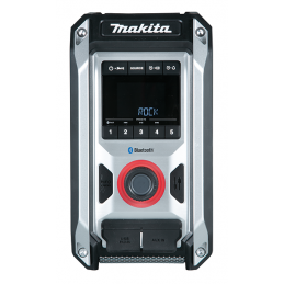 Makita DMR114B je robusten akumulatorski gradbeni radio, zasnovan za uporabo na zahtevnih deloviščih. Omogoča predvajanje glasbe preko FM/AM radia, Bluetooth povezave ali AUX vhoda, hkrati pa nudi visoko kakovost zvoka zahvaljujoč zmogljivim stereo zvočnikom in vgrajenemu nizkotoncu. Radio deluje z Makita CXT in LXT akumulatorji ali preko priloženega omrežnega adapterja, zaščita IP65 pa zagotavlja odpornost proti prahu in vodi.