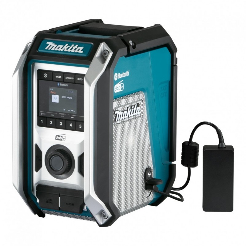 Makita MR006GZ akumulatorski 12V-18V-40V prenosni radio se ponaša s funkcijo BLUETOOTH, uporabniku pa nudi možnost napajanja z AC ali akumulatorjem. Vgrajen tudi nizkotonec!