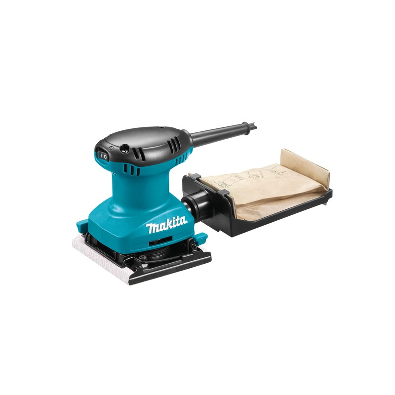 Makita BO4555 električni vibracijski brusilnik z močjo 200 W. Nima regulatorja za nastavitev števila vrtljajev. Brusna ploskev meri 112 x 102 mm.
