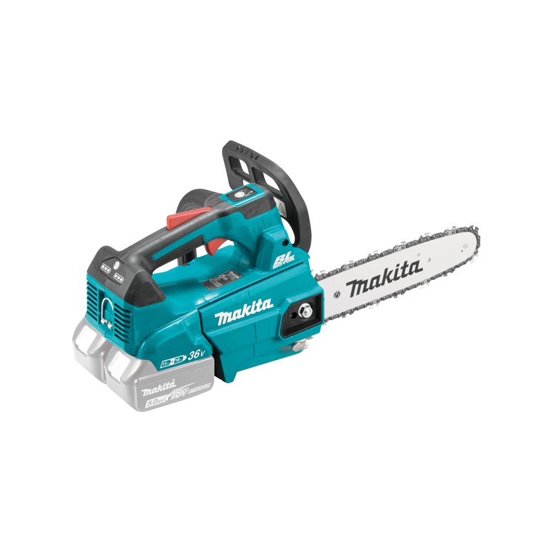 Makita DUC355Z – 18V akumulatorska verižna žaga na 2 bateriji. Dolžina meča 350 mm za zahtevnejša opravila, tudi podiranje drevja! Verigo se zateguje klasično z vijaki, meč se pritrdi z orodjem.