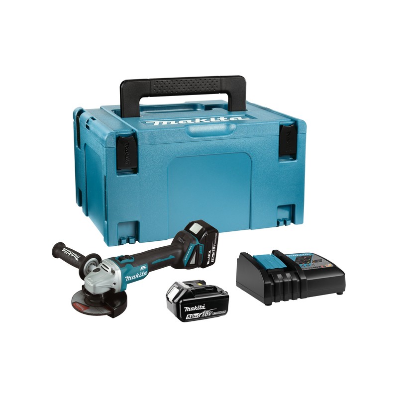 Makita DGA504RTJ akumulatorski kotni brusilnik / 2x 5,0 Ah / hitri enojni polnilec / kovček Makpac.